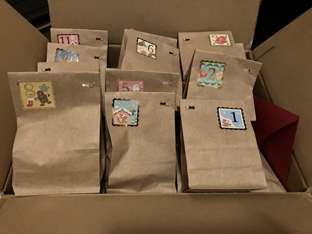 先月末に金沢に住む友人から去年に引き続き、私の息子たちへアドベントカレンダーを届けてくれました。一つ一つ紙袋に入れて。